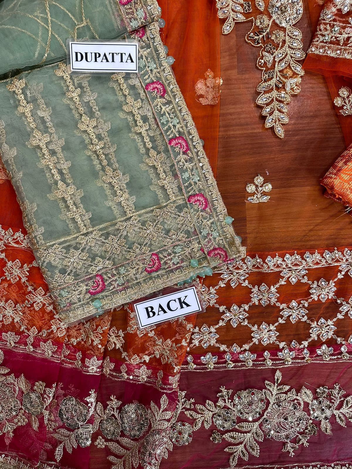 Rich Fabric Mix: Net front and back with round ghera embroidery, organza & crape pattis, and a delicately bordered net dupatta.