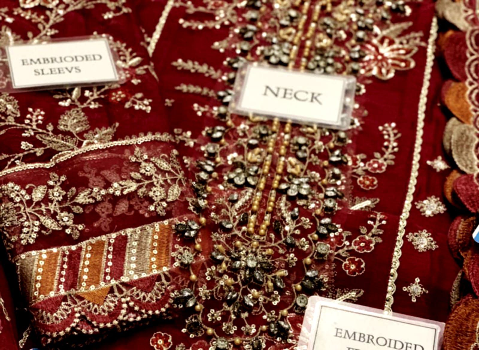 Chiffon front panels heavily embroidered with intricate spangle work, enhanced with a detailed embroidered neckline and hand embellishment.
