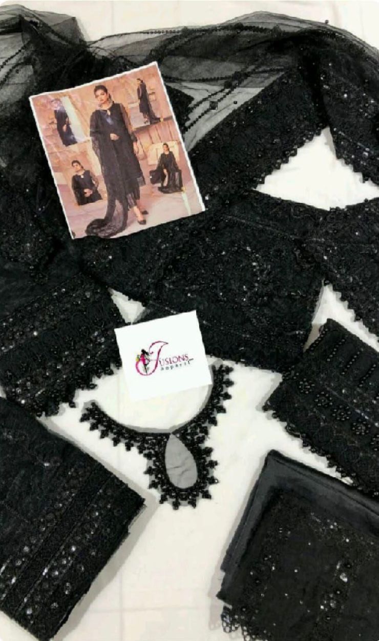 Dupatta: Net dupatta with 4-side applique embroidery – ready-to-wear and luxurious.